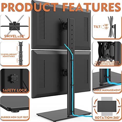 Dual Monitor Stand – Vertical Stack Screen Free-Standing Monitor Riser Fits Two 13 to 34 Inch Screen with Swivel, Tilt, Height Adjustable, Holds One (1) Screen Up to 44Lbs