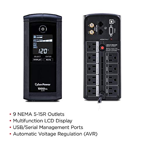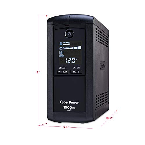 Specification: CyberPower CP1000AVRLCD Intelligent LCD UPS System, 1000VA/600W, 9 Outlets, AVR, Mini-Tower, Black