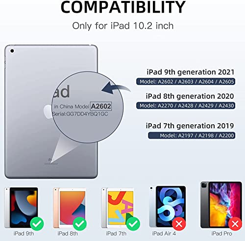 Compatibility: Case specially designed for iPad 10.2 inch iPad 9th/8th/7th Generation 2021/2020/2019. NOTE: Not Compatible with any other device, please check your iPad model number before placing order
