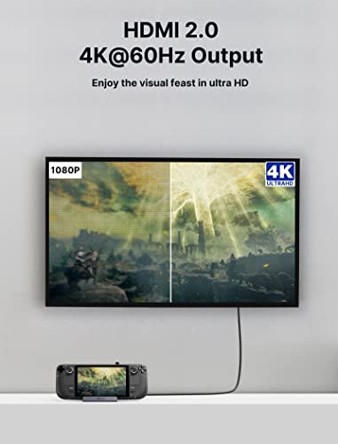 【4K@60Hz HDMI Output】The Steam Deck Dock comes with a 4K@60Hz HDMI 2.0 output. When you connect an external 4K monitor, it can provide you sharper and smoother visual experience, so you can enjoy the visual feast on your games.