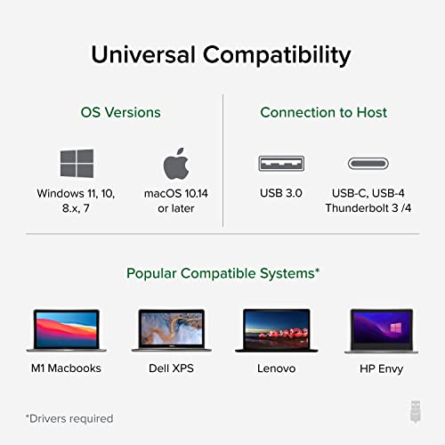 COMPATIBILITY – Laptop docking station is compatible with Windows 11, 10, 8.x, and 7, ChromeOS 100+, and macOS 10.14+. Plug and play driver installation via Windows Update; manual driver installation on Mac. Linux not supported. Dock does not charge host PC.