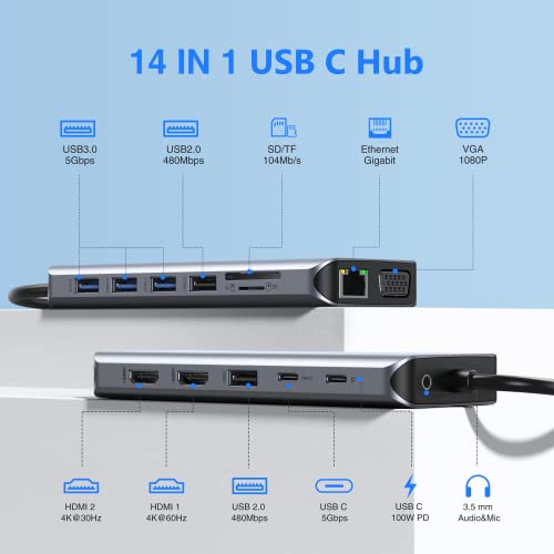 Specification: USB C Docking Station Dual Monitor for Dell/HP/Lenovo/Surface Laptop, 14 in 1 Triple Display Hub Multiple Adapter, Dongle with 2 HDMI 4K+VGA+5 Port+100W PD Charger+Ethernet+SD/TF+Audio